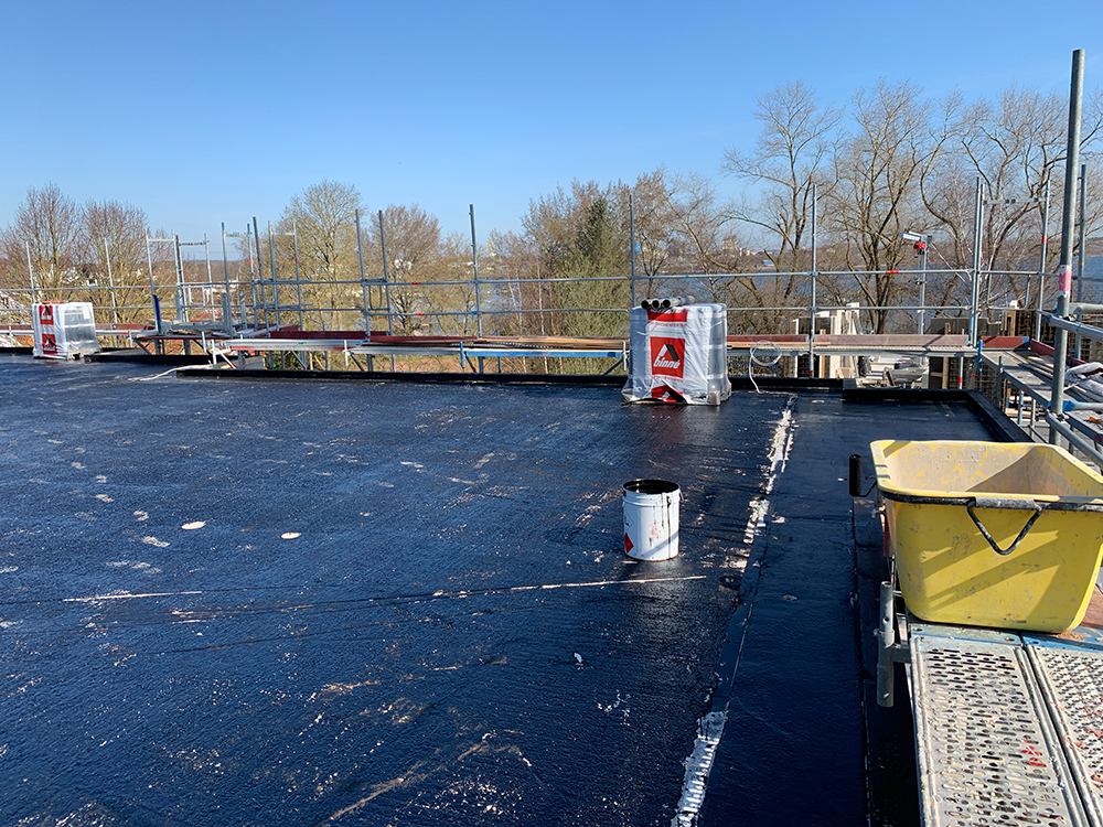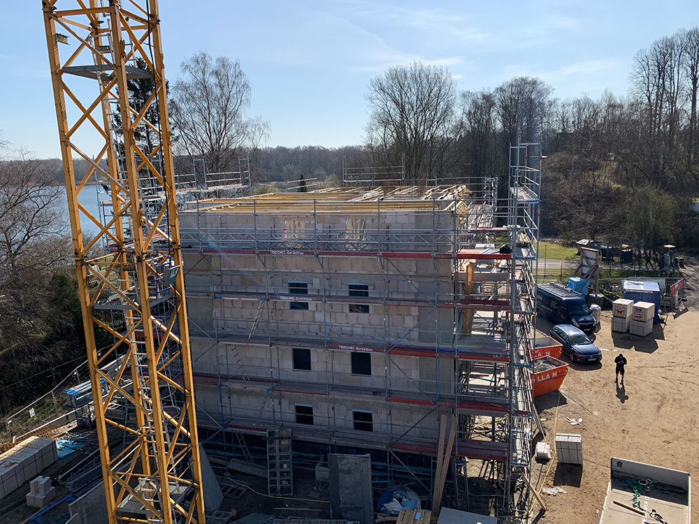 Im Haus 1 laufen die Vorbereitungen für die Betonage der Decke des 3. OG. Währenddessen wird im Haus 2 das 3. OG gemauert und in Haus 3 erfolgen Abdichtungsarbeiten in der Decke. Die Fenster sind schon eingebaut und demnächst geht dort schon der Innenausbau los.