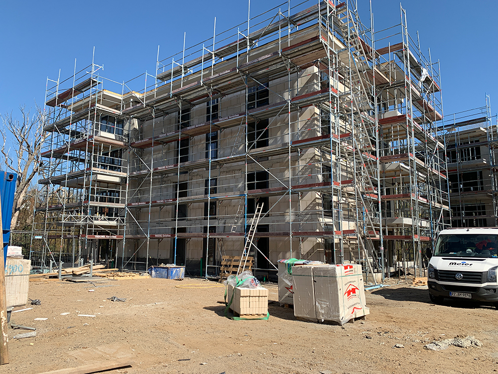 Im Haus 3 werden die Innenwände gestellt und parallel die Bäder von der Heizungs- und Sanitärfirma vorbereitet. Im Haus 2 hat der Elektriker mit den Vorarbeiten angefangen, während im Haus 1 die Fenster eingebaut werden.